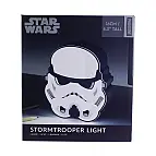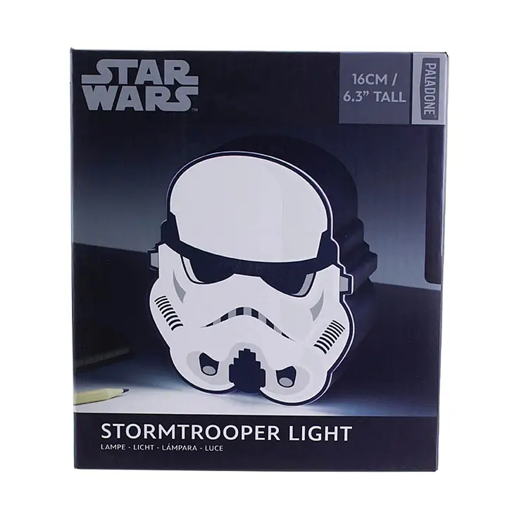 - La lampe Star Wars en forme de casque de Stormtrooper est emballée dans une boîte en carton illustrée.