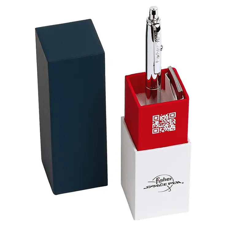 - Le stylo Fisher AG7 est emballé dans une boîte en carton illustrée.