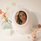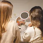 Son miroir intègre une lumière LED idéale pour le maquillage, qui s'allume et s'éteint à l'aide d'un bouton tactile. Vous pouvez également modifier l'intensité de la lumière en appuyant sur le bouton. Il fonctionne sans avoir besoin d'être branché, sa batterie se recharge à l'aide d'un câble micro USB (inclus). Avec une charge complète, elle peut rester allumée pendant 4 heures.
