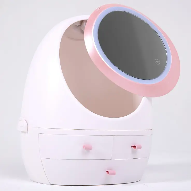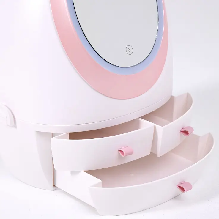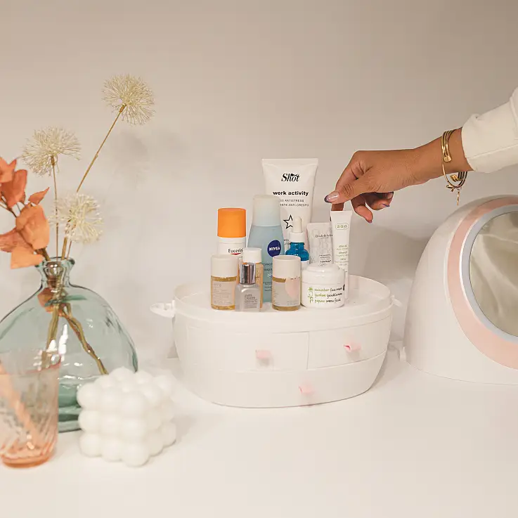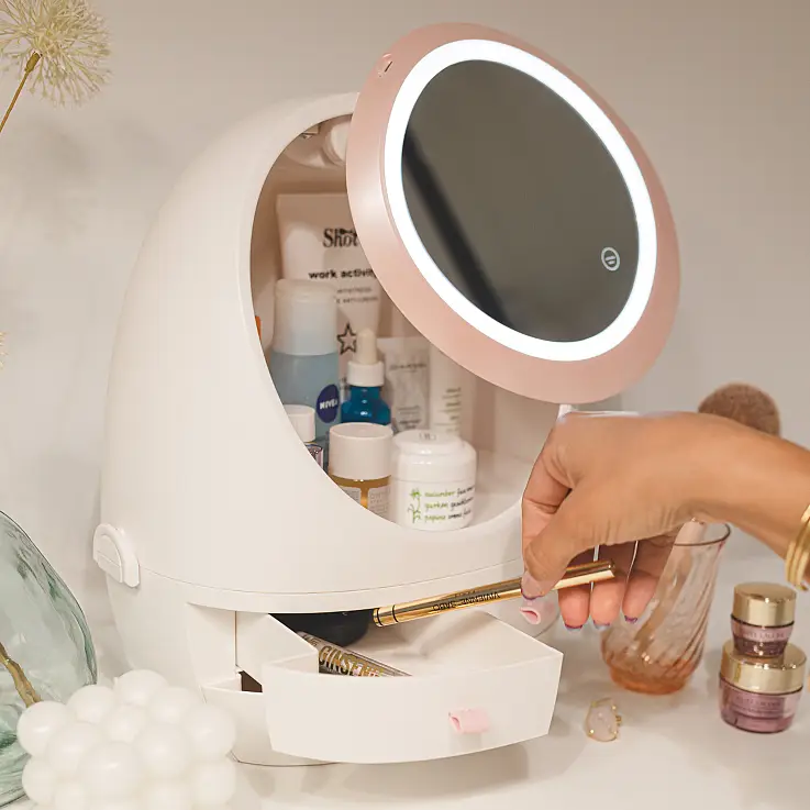Fond de teint, anticernes, rouge à lèvres, palette d'ombres à paupières, crèmes... tout est bien rangé et à portée de main dans cet organiseur de maquillage avec miroir et lumière LED.