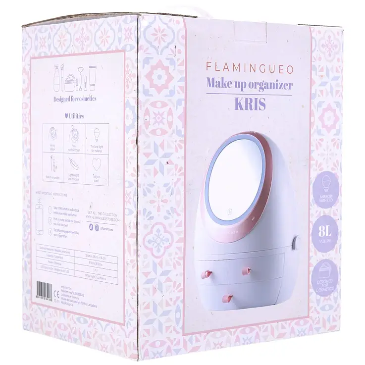 - L'organiseur de maquillage avec miroir est emballé dans une boîte en carton illustrée.